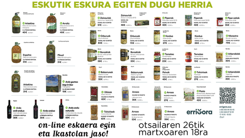 La iniciativa Errigora, que se desarrolla gracias al trabajo comunitario de personas de toda Euskal Herria, ha puesto en marcha la campaña de primavera para la venta de aceite y conservas. Como en ocasiones anteriores, una buena oportunidad de tener en casa productos de la huerta navarra. Los pedidos se realizarán del 26 febrero al 18 de marzo.